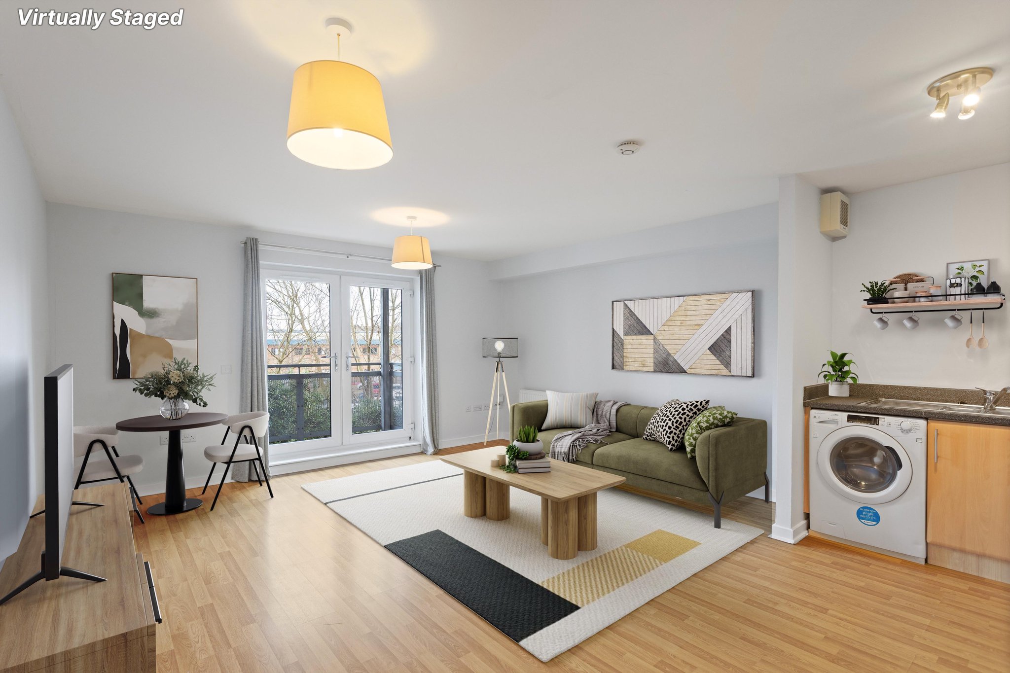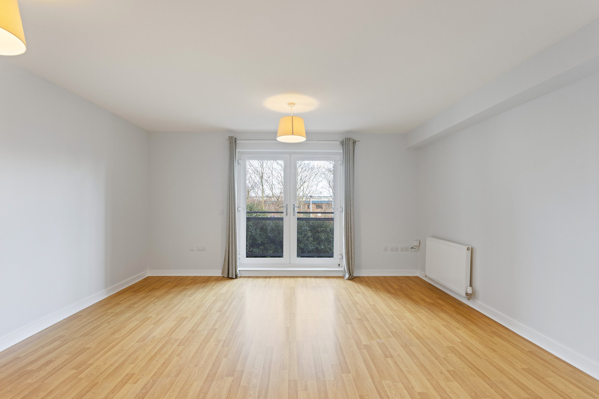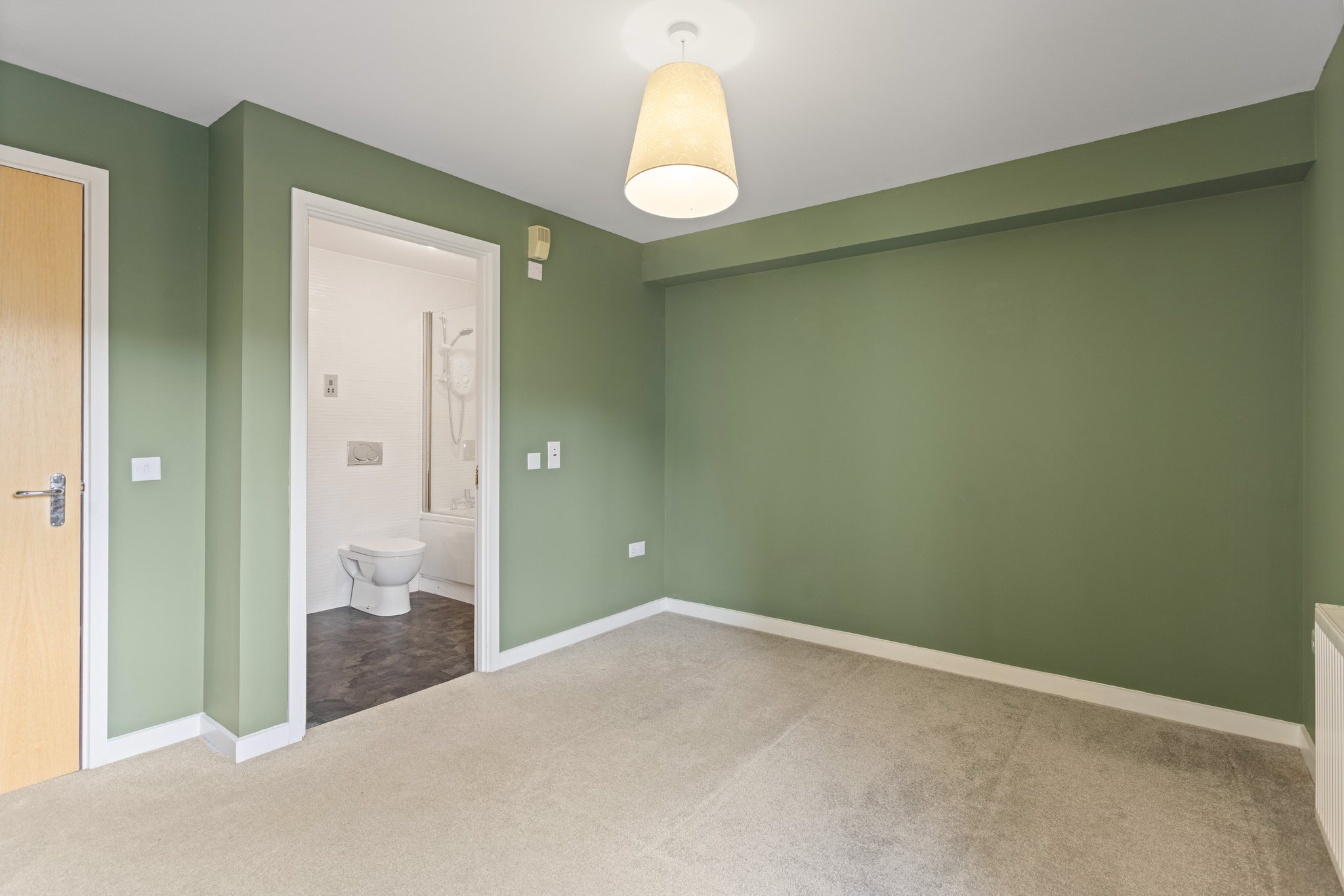 Internally, the flat offers generous and well-proportioned accommodation throughout. The bright and spacious open-plan living, kitchen and dining area forms the heart of the home, with double doors leading out to a small private balcony, allowing for additional light and outdoor space. The principal bedroom is a comfortable double and benefits from fitted wardrobes and a private en-suite bathroom complete with a shower over bath. A second well-sized double bedroom provides flexible accommodation, ideal for guests, family members, or a home office. The property is further served by a modern main shower room located off the hallway. The hallway itself offers excellent storage with two large cupboards, enhancing the practicality of the home.